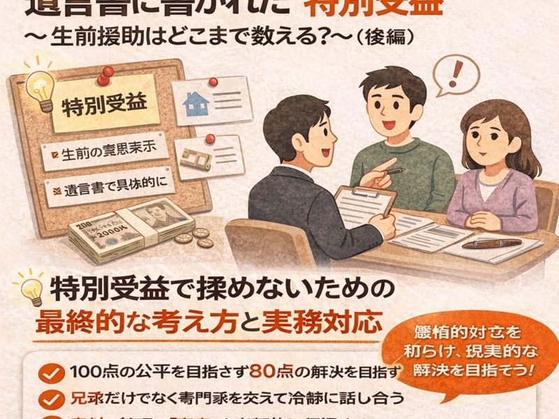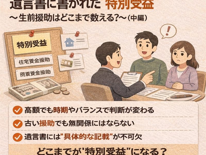 続きを読む前編では、特別受益の基本的な考え方と揉めやすさを、中編では、どこまでが特別受益として認められるのか、その判断基準を整理しました。 後編では、特別受益をめぐるトラブルをどう防ぐか、そして相続人が現実的に取るべき対応をまとめ …
