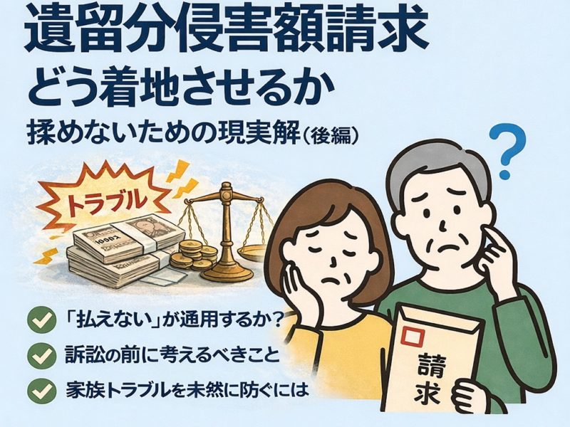 続きを読む前編では、遺留分という制度の基本と、中編では、遺留分侵害額請求の計算方法や請求の流れを整理しました。 後編では、実際に遺留分侵害額請求が持ち上がったとき、どう向き合い、どう着地させるか、実務で重要になる考え方をまとめます …