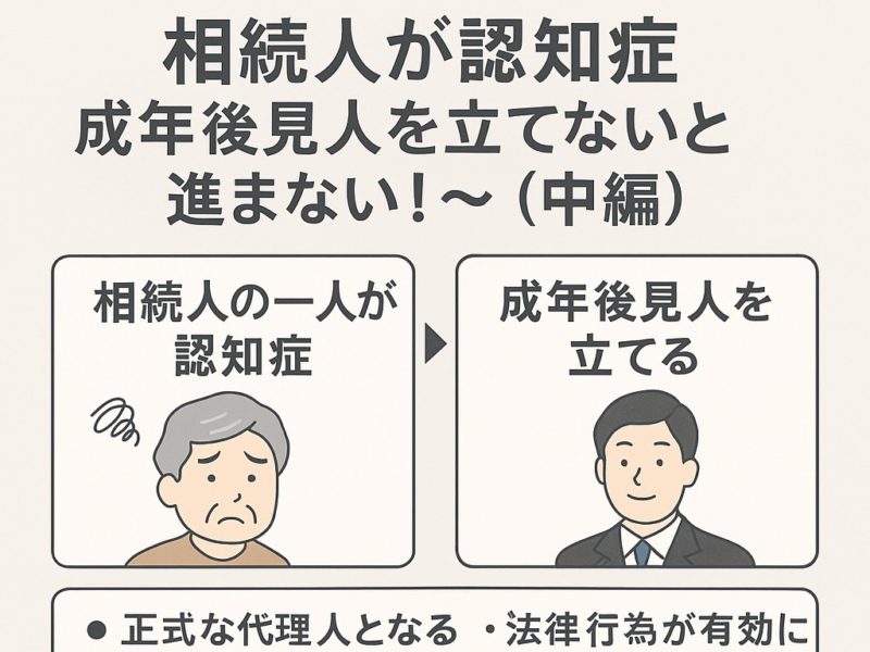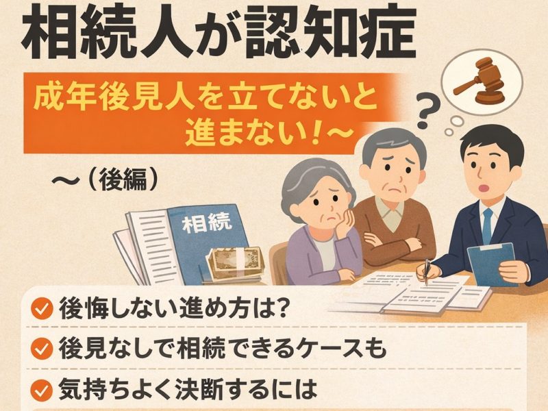 続きを読む前編では、相続人の一人が認知症の場合、原則として相続手続きが止まること、中編では、成年後見人を立てると相続がどう進むのか、その現実的な影響を整理しました。 後編では、「本当に成年後見制度を使うべきか」そして 後悔しない判 …
