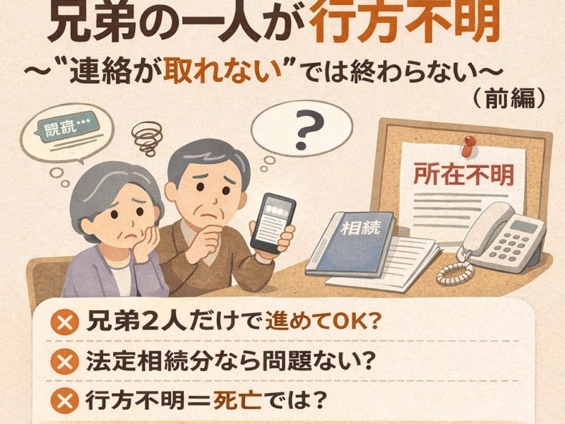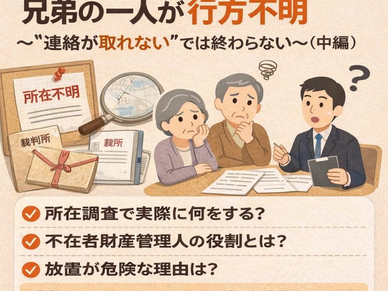 続きを読む前編では、相続人の一人と連絡が取れないだけで、相続手続きは原則として進められないことを整理しました。中編では、**「本当に行方が分からない場合、何から始め、どこまでできるのか」**を解説します。 ■まず必要なのは「本当に …