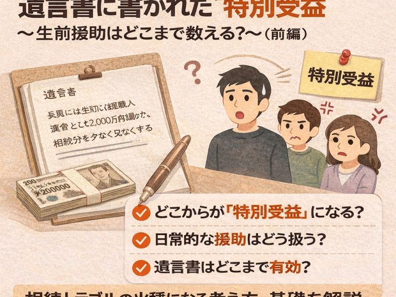 「遺言書に“長男は生前に多額の援助を受けているため相続分を減らす”と書かれていました。これって本当に有効なんでしょうか?」 相続の現場で、近年とても増えている相談です。ポイントになるのが、**「特別受益」**という考え方 …