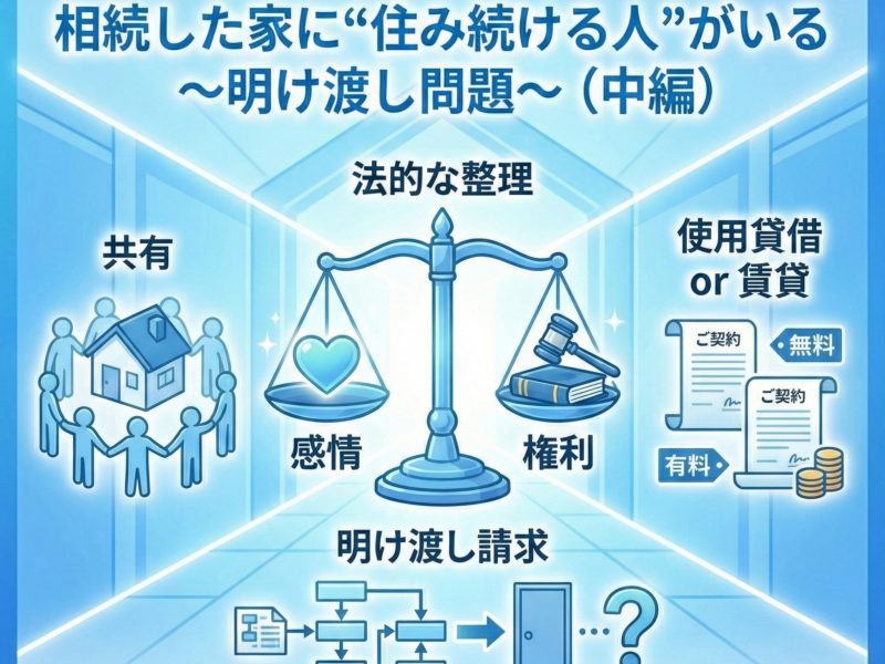 前編では、相続した家に誰かが住み続けている場合、話し合いが感情的にこじれやすい理由を整理しました。 中編では、この問題を法的にどう整理するのか、実務で必ず押さえるべき考え方を解説します。 ■相続発生後の家の法的な状態 相 …