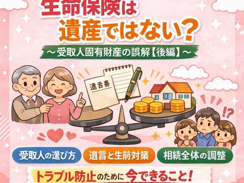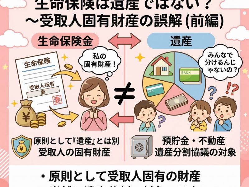 続きを読む前編では、生命保険金は原則として「受取人固有の財産」であり、当然に遺産分割の対象になるわけではない、という基本を整理しました。 もっとも、実際の相続では、これだけで話が終わらないことがあります。なぜなら、生命保険金の額や …