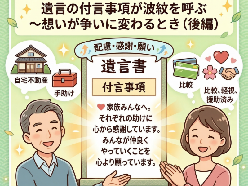 続きを読む前編では、遺言書の「付言事項」が本来は家族への想いを伝えるものである一方、書き方によっては相続人の感情を刺激し、争いの火種になることがある点を解説しました。 中編では、付言事項に書かれた「理由」や「評価」が、相続人同士の …